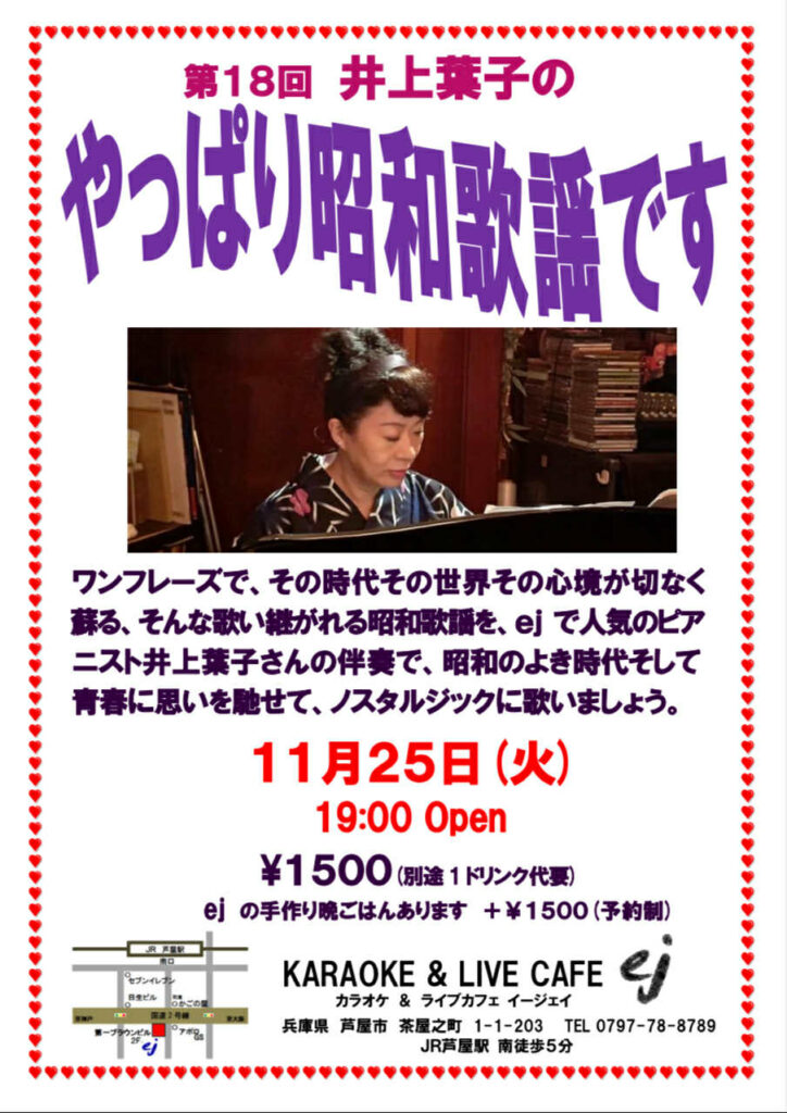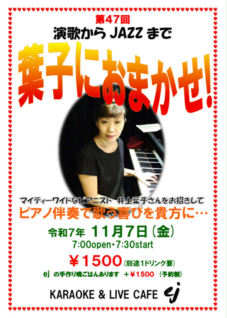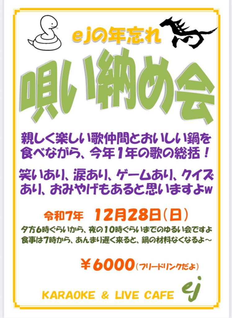 令和7年12月28日 ejの年忘れ唄い納め会のご案内です。今年の締めくくりは唄い納め会にてカラオケ愛好家のみなさんとさらに親睦を深め楽しい時間を過ごしましょう♡